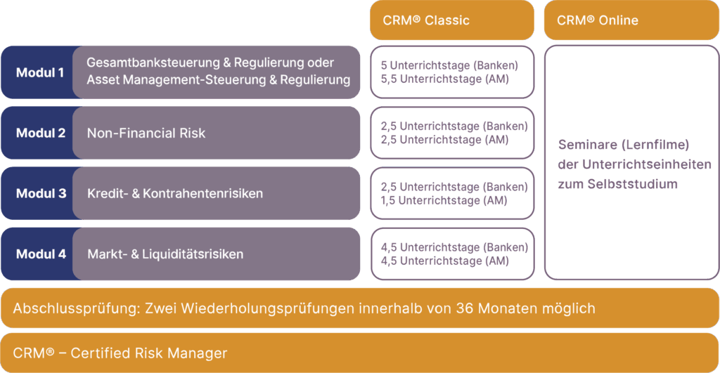 Sie können in unserem CRM Programm zwischen zwei Vertiefungs-möglichkeiten auswählen. Für Asset Manager sind Module entwickelt worden im Bereich der Risikoeinschätzung, -entscheidung und -steuerung. Für Teilnehmer aus Banken werden Themen wie z.B. Gesamtbanksteuerung, Stresstest oder Regulatorische Kapital-anforderungen praxisnah und aktuell vermittelt.